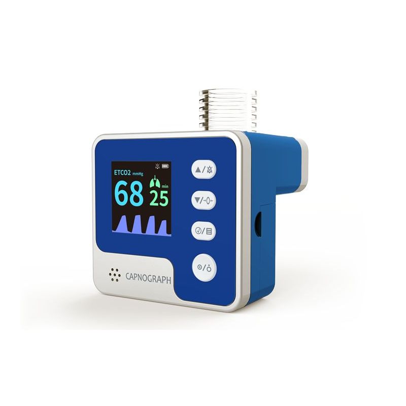 Capnograph adopts mainstream method to measure the end-tidal carbon dioxide, airway respiration rate and other parameters. It can detect pulmonary ventilation function and reflect the circulation and pulmonary blood flow condition, as well as indirectly reflect the alveolar ventilation, which is applicable for use in pre-hospital emergency transfer, emergency department, ICU, operating room, neonatology, respiratory department and other occasions. The application population is adult, pediatric and neonate patients. The Capnograph connects with patient’ respiratory tract by the airway adapter and breathing tube.